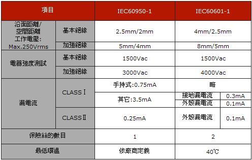 根據(jù)安規(guī)標(biāo)準(zhǔn),EN60950-1 ClassI最大漏電流不可超過3.5mA;而EN60601-1最大漏電流不可超過0.3mA。量測時各別的安全距離、保險絲數(shù)量多有不同,其相關(guān)差異如下表列: